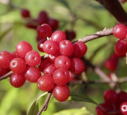 - Плоды: Ярко-красные, коралловые, с кисло-сладким вкусом. Созревают в сентябре-октябре и могут висеть на кусте до морозов.